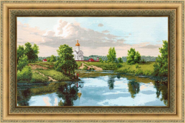 Водная гладь реки, расположенная в центре картины, словно волшебное зеркало, отражает голубое небо, рядом растущие деревья и величественный Храм Руси. Местность, представленная в наборе для вышивки, передаёт всю красоту, гармонию и состояние души Русской земли. На картине можно разглядеть профессионалов рыбной ловли и стаю небольших уток, которые не привлекают особого внимания, но гармонично вписывающихся в общую композицию.| Скидка | 3 % | 5 % | 7 % | 10 % | 15 % |