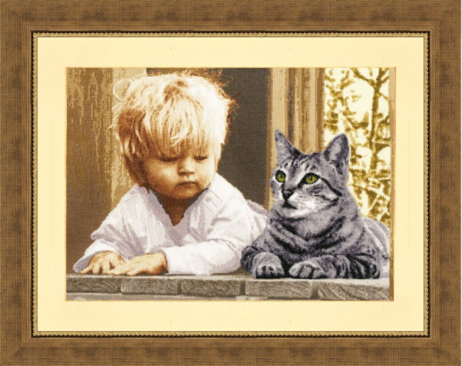 Посмотрите какую красоту вышила моя мама! Мне этот очаровательный малыш напоминает героя старого советского фильма "Нахаленок". А с таким серьезным котом уж точно не забалуешь.