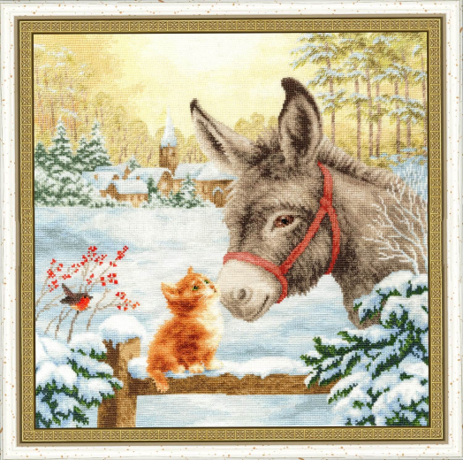 На канве перед нами оживают милые образы - добрый ослик и игривый котёнок среди пушистых елочек, укрытых снегом.